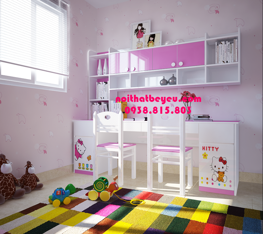 Bàn học cho 2 bé gái thiết kế hình ảnh Hello kitty