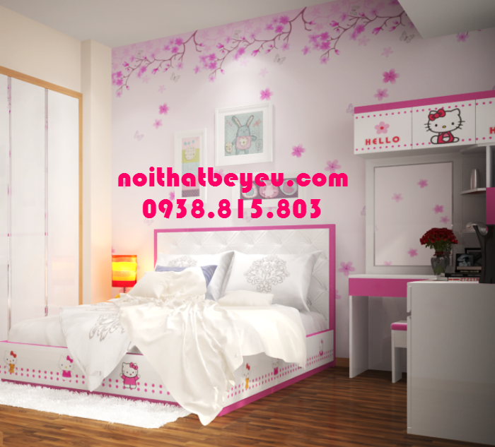 Bộ giường ngủ đẹp cho bé gái được thiết kế đầy đủ tiện nghi với hình ảnh Hello kitty