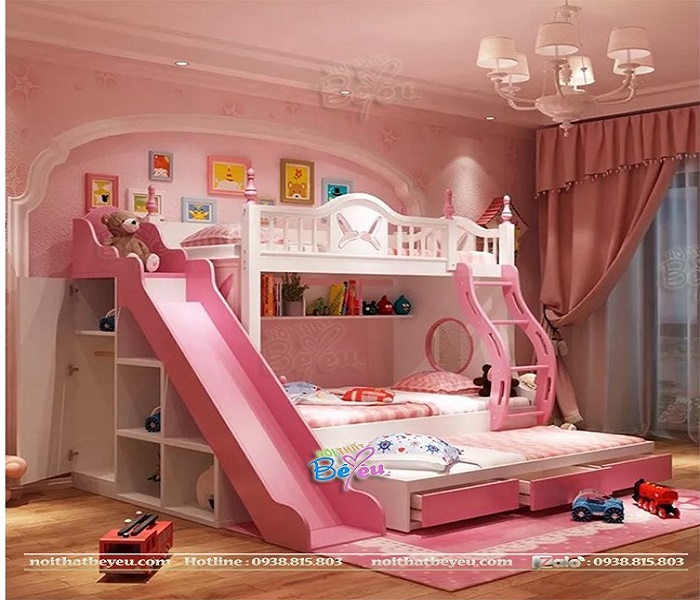 Giường hai tầng màu hồng có cầu trượt cho bé gái