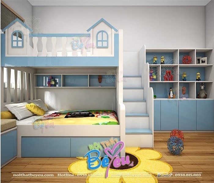 Tổng thể bố trí giường 2 tầng và phòng ngủ cho bé trai