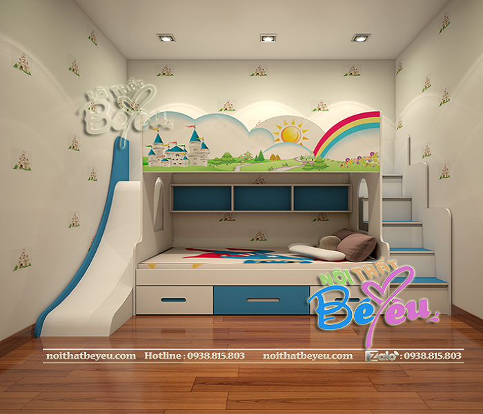 Với thiết kế Giường tầng Cho bé gái lâu đài có cầu trượt với màu xanh trẻ trung và dễ thương, chiếc giường tầng trẻ em với màu sắc hình ảnh sinh động, cùng thiết kế bắt mắt đẹp luôn khiến các bé thích thú và yêu căn phòng nhỏ của mình hơn. với giường tầng công chúa có cầu trượt thì các bé có thể vui đùa, năng động bởi giường tầng cầu trượt