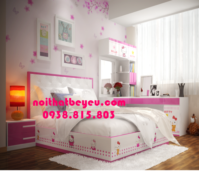 phòng ngủ cho be gái được thiết kế đầy đủ tiện nghi giường và bàn học được in hình hello kitty dễ thương