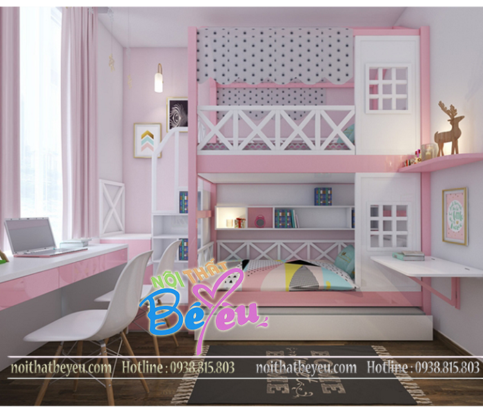 Với không gian nhỏ sử dụng cho 2 bé giường tầng là một ý tưởng tuyệt vời, Tiết kiệm không gian diện tích, Với kiểu thiết kế giường Tầng hình ngôi nhà tạo cảm giác cho các bé như sử dụng ngôi nhà của chính mình và cũng là điều mơ ước của các bé, với không gian xinh xắn cho các bé học góc tập vui chơi giải trí hoạt bát giúp bé tư duy tốt và phát triển thể chất