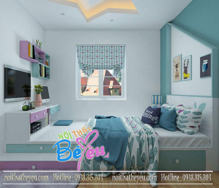 Màu sắc của căn phòng sử dụng các gam màu trắng be làm chủ đạo tạo nên sự tươi mới đẹp mắt và gần gũi cho bé sử dụng tạo không gian rộng rãi và thông thoáng, Vách đầu giường được nhấn màu xanh ngọc hình mái nhà bắt mắt, nhã nhặn tạo không gian trẻ trung đầy năng lượng