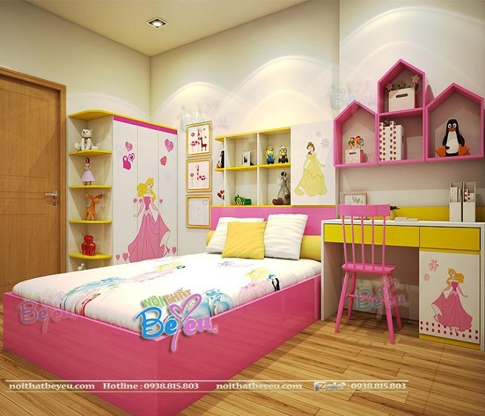 Phòng ngủ được Nội Thất Bé Yêu thiết kế đơn giản dễ thương những hình ảnh công chúa xinh xắn kết hợp với màu hồng trắng và vàng tạo một không gian sống động, đáng yêu.
