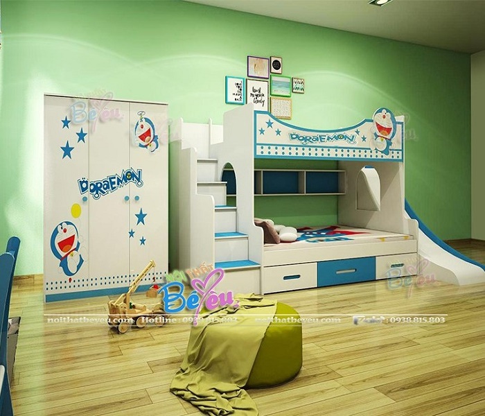 Phòng ngủ được nội thất bé yêu thiết kế nhân vật Doremon trong phim hoạt hình đang được rất nhiều bạn nhỏ yêu thích.
