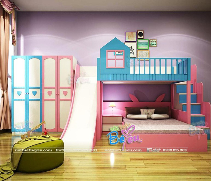 Bộ phòng ngủ được nội thất Bé yêu thiết kế với kiểu giường 2 tầng kết hợp cầu trượt cho các bé học tập và giải trí với cầu trượt