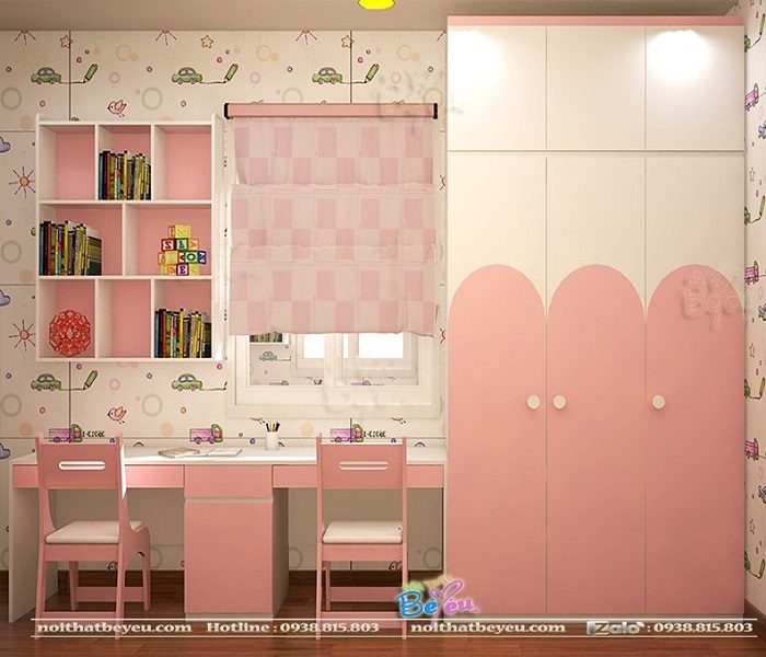 Tủ áo màu hồng cho bé gái được thiết kế cao sát trần